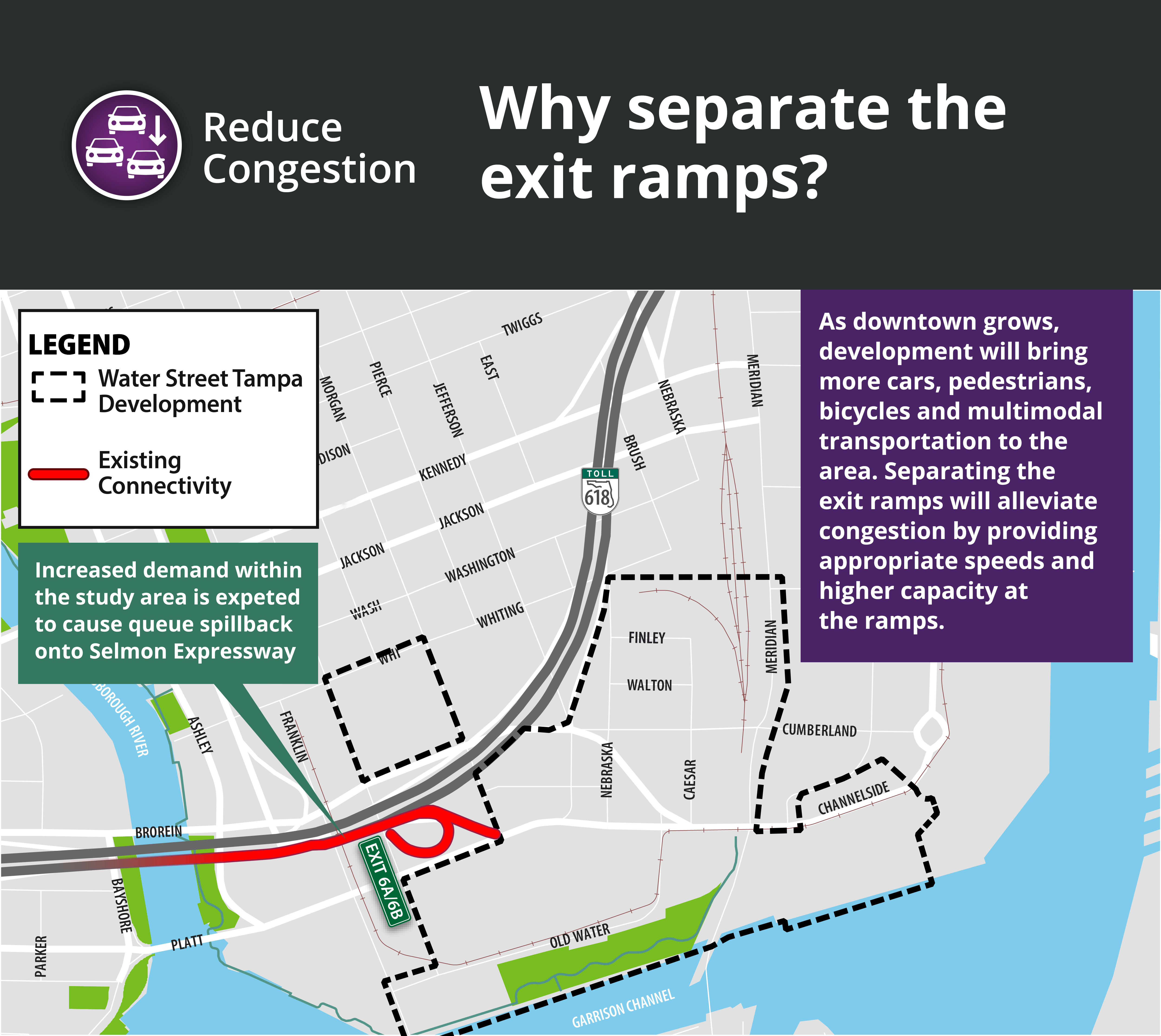 As part of the preferred alternative, the existing ramp for Exit 6B would be moved to the north to connect to Whiting Street instead of Channelside Drive (see Location D). The ramp would begin with 1 lane and end with 3 lanes, 1 for turning westbound (left) and 2 to turn eastbound (right) onto Whiting Street. Moving the ramp for Exit 6B would require two modifications to what is out there today. The beginning of the entrance ramp from Jefferson Street to the eastbound Selmon Expressway would move to the north to make room for moving Exit 6B. And a connection between Nebraska Avenue and Finley Street would be constructed.