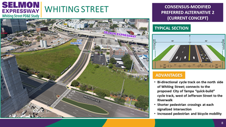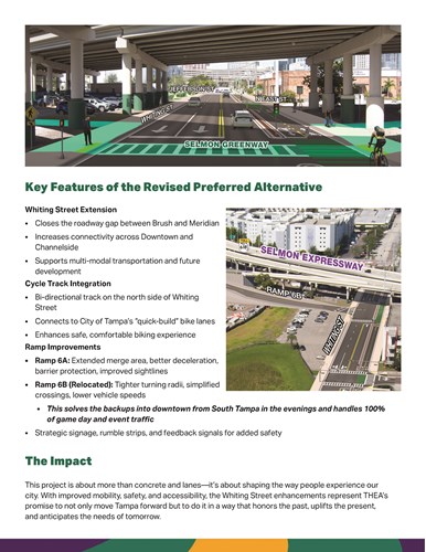 On February 22, 2022, a Public Hearing was held at the THEA boardroom to present the project’s preferred alternative to the general public, project stakeholders, and other interested parties. Based on comments received during this hearing, and during subsequent meetings with project stakeholders such as the City of Tampa, it was determined that the project preferred alternative should be revised to only address proposed improvements to Whiting Street and its connection to Meridian Avenue, and the removal of the eastbound Channelside Avenue off-ramp and replace it with a ramp connecting to Whiting Street. The Florida Avenue off-ramp would remain one lane, and a rectangular rapid flash beacon (RRFB) pedestrian signal would be added at the ramp’s connection with Florida Avenue.
