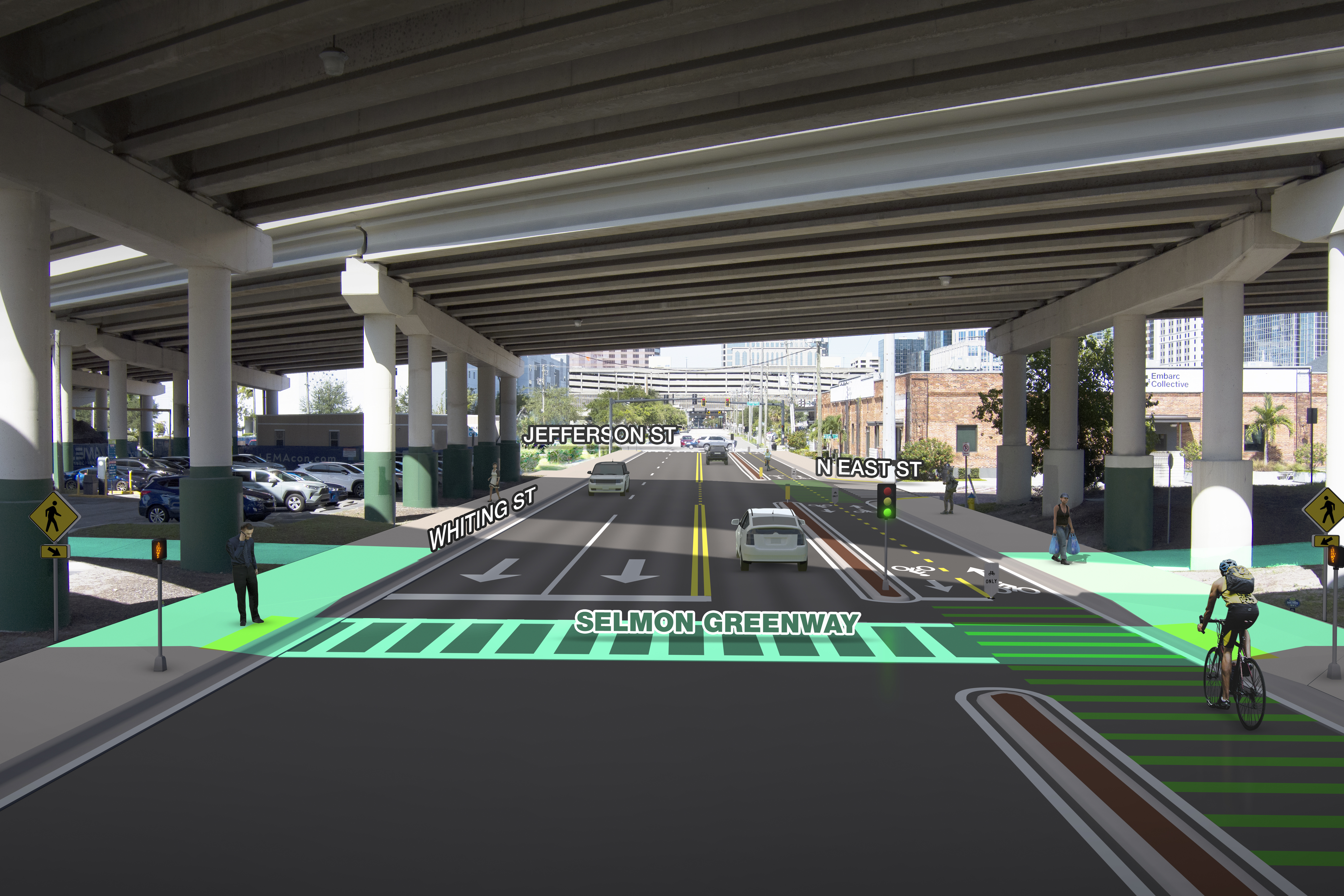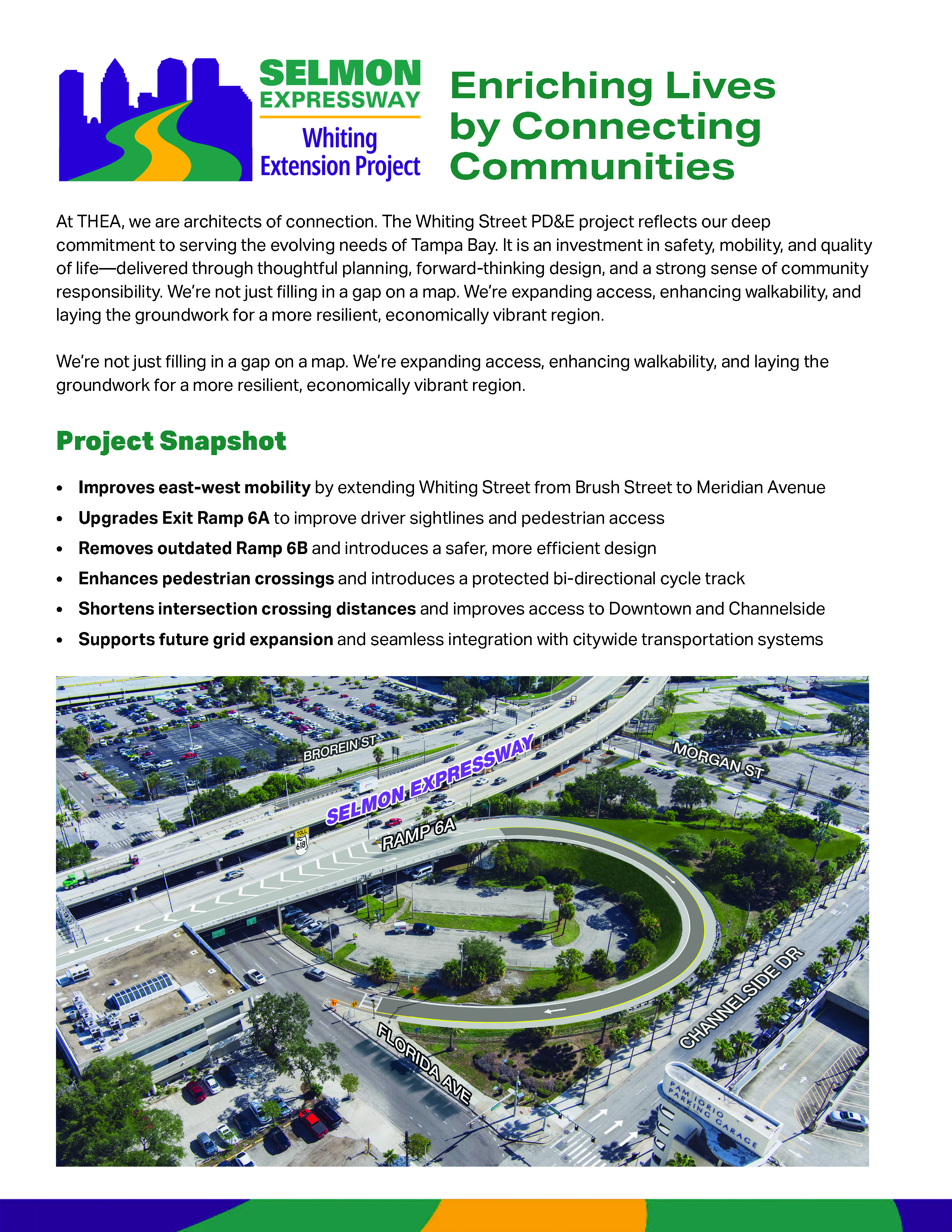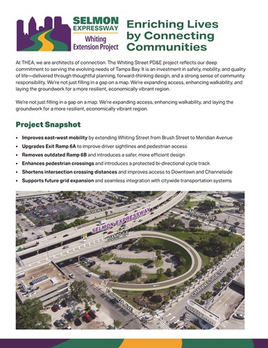 The Tampa Hillsborough Expressway Authority (THEA) is conducting a Project Development and Environment (PD&E) Study to connect Whiting Street to Meridian Avenue to improve the street network in eastern downtown Tampa. We are also looking at ways to improve operations and safety for Whiting Street between Jefferson Street and Brush Street, the Jefferson Street entrance ramp, and the downtown Tampa eastbound exit ramps. We’re looking at potential improvements that will enhance safety and community connections in downtown Tampa.