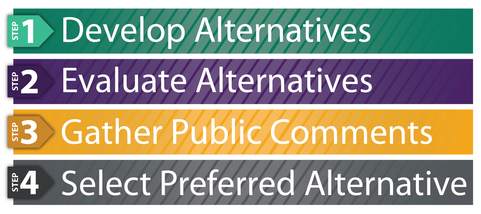 Read through each of the four steps below to see our process, a summary of the alternatives that are being considered, and how the Preferred Alternative will be identified. Please note, a No Build alternative is being considered throughout this study process.