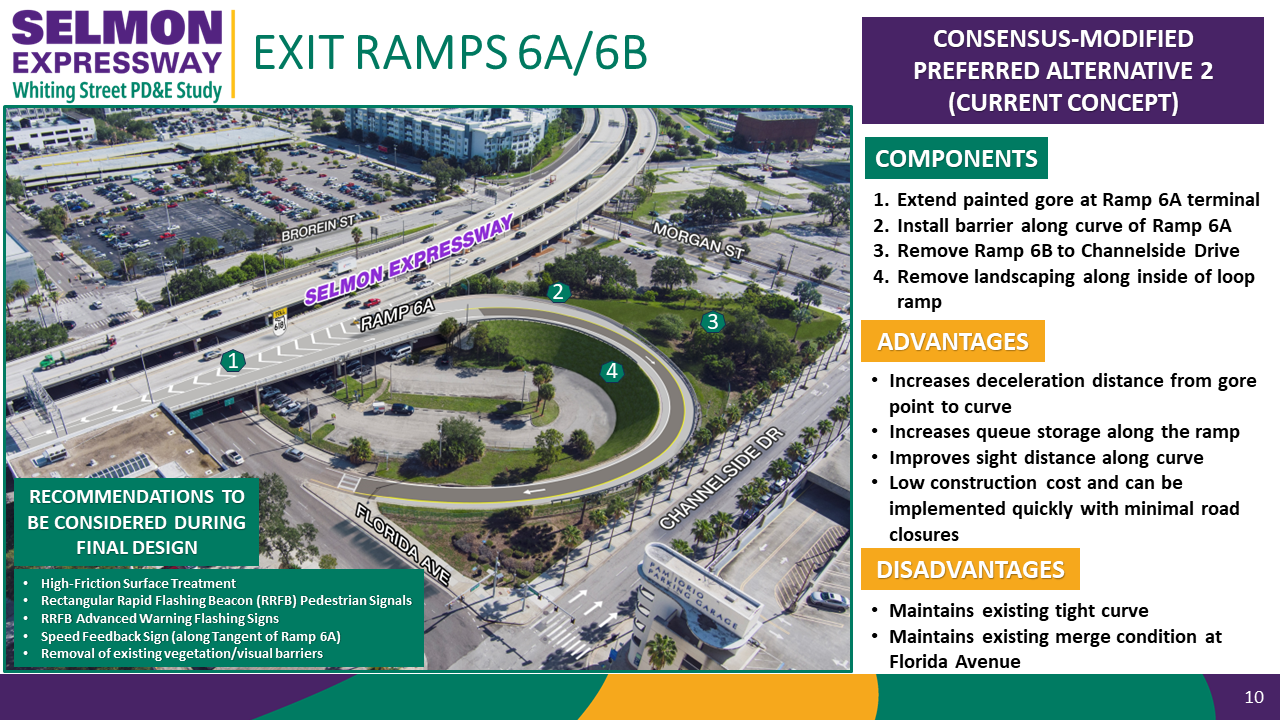 Modifications to Exit 6A would include lengthening the striping for the exit to begin earlier. Safety improvements to the loop ramp would include adding a high friction surface, adding a pedestrian signal at the ramp’s connection with Florida Avenue, and removing the existing landscaping within the inside of the ramp loop to improve sight distance.