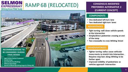 The new ramp would have three lanes where it meets Whiting Street. One lane would turn left (west) onto Whiting Street and two lanes would turn right (east) onto Whiting Street. Enhanced crosswalks would be constructed on either side of the ramp to cross Whiting Street and at the end of the ramp.